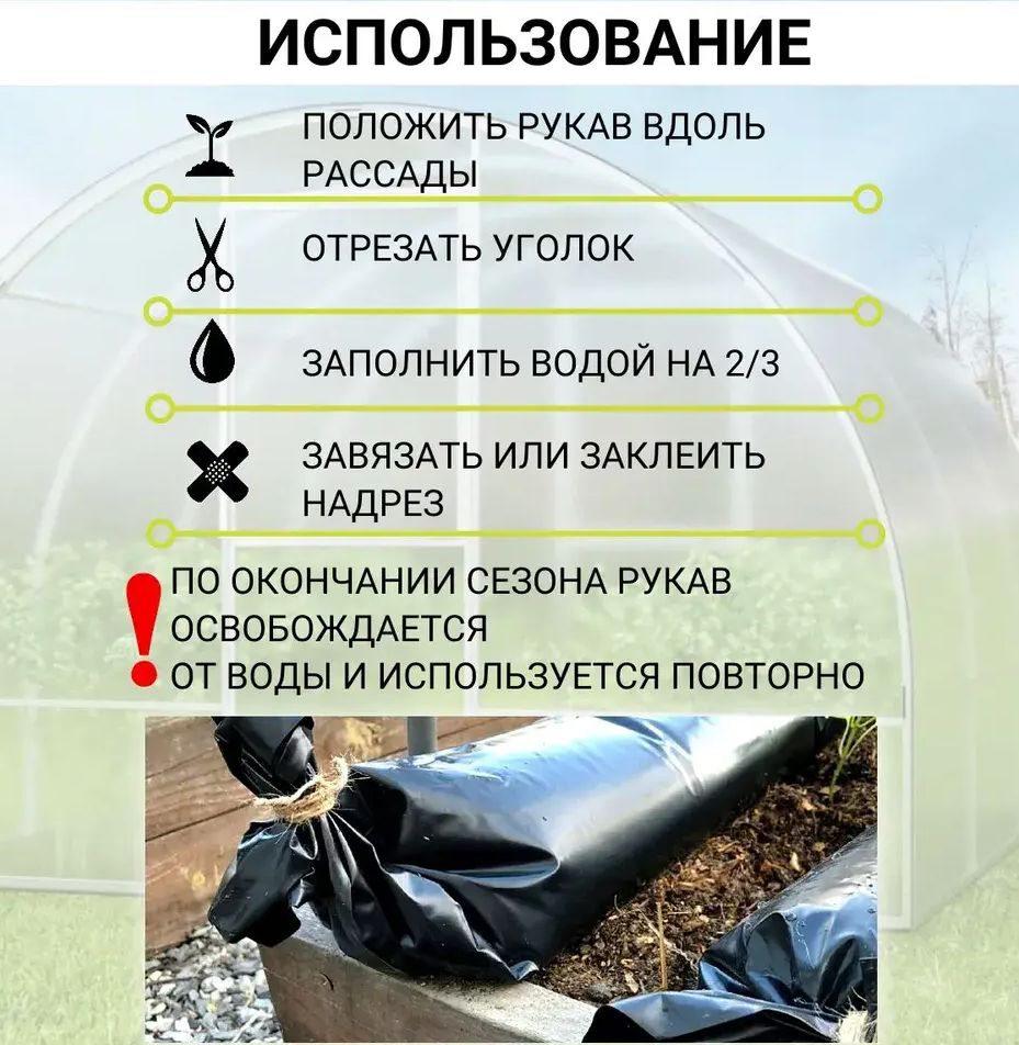 Аккумулятор тепла применяется в теплицах и парниках для выравнивания дневных и ночных температур. Он представляет собою рукав, заполненный водой. Днем черная пленка поглощает тепло и отдает его воде, ночью тепло потихоньку возвращается в теплицу или на грядку.