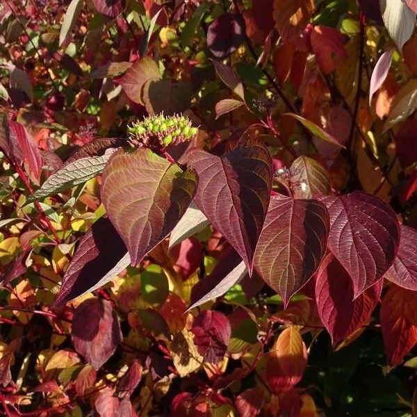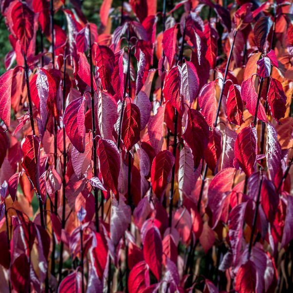 Это среднерослый сорт высотой в 2 м и с такой же шириной. Он растет быстро, у него раскидистая крона округлой формы и прутьевидные побеги. Цвет побегов – черно-коричневый. Листья имеют шесть пар жилок, они овальные, с морщинистой поверхностью. Размер листовой пластины – до 12 см. Весной листочки дерена темно-коричневые, а летом – коричнево-зеленые. Каймы нет.