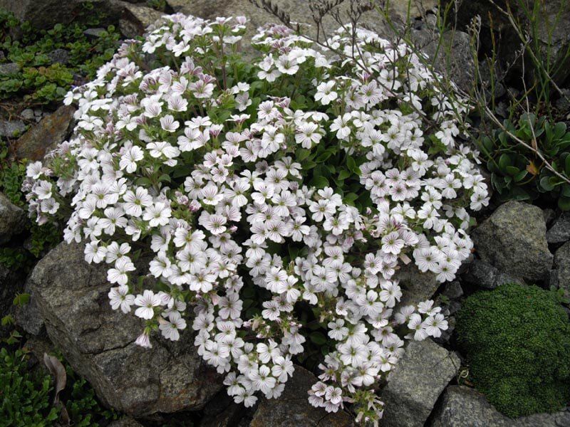 Многолетнее почвопокровное растение высотой 8-13 см и шириной до 20 см. Корневая система поверхностная. Листья: овальные, мелкие (около 3 см в длину), зеленые. Цветение приходится на май-июль. Появляется множество невысоких цветоносов с мелкими (около 2 см) белыми цветочками с прожилками. После окончания цветения на соцветиях образуются коробочки с семенами.