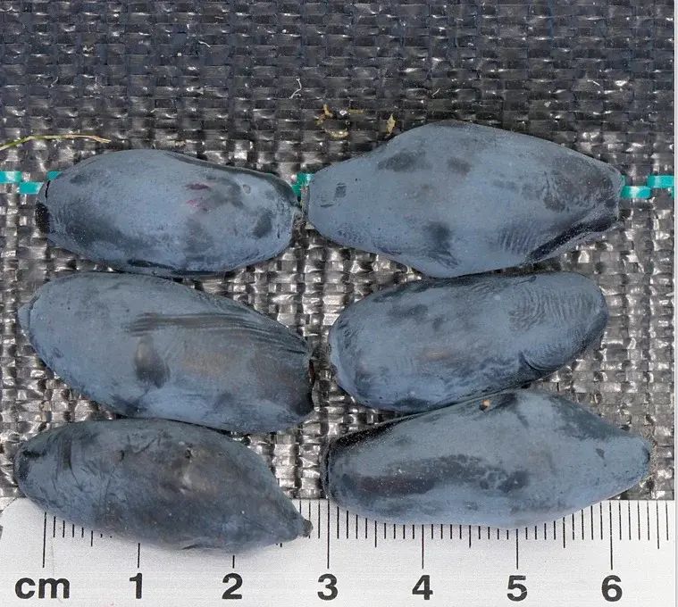 Плоды: красивые, овальной сердцевидной формы, сизо-фиолетовые, упругие и мясистые, с очень толстой кожицей, что значительно облегчает сбор урожая. Крупные: до 3 см длиной, до 1 см в диаметре, массой до 4 г.