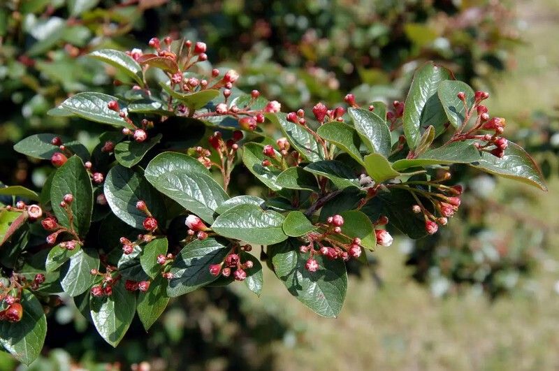 Молодые побеги растения густо опушены. Листья кизильника блестящего заостренные, светло-зеленые летом и темно-красные или пурпурные осенью.