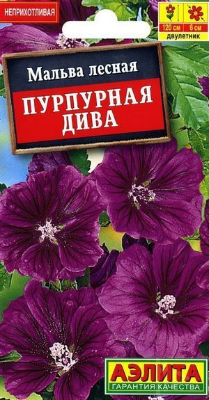 Мальва лесная Пурпурная Дива - неприхотливый однолетник. Отличается эффектной окраской цвета спелой сливы с более темными прожилками. Прямостоячие кусты высотой до 120 см имеют очень продолжительный период цветения. Крупные цветки  диам. 5-6 см формируются гроздьями по 5-10 шт. в пазухах красивых орнаментальных листьев. Растение устойчиво к летней жаре и засухе; в фазе проростков выдерживает заморозки до -2…-3С.
