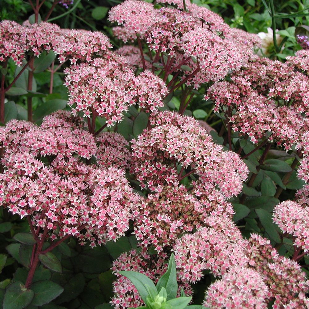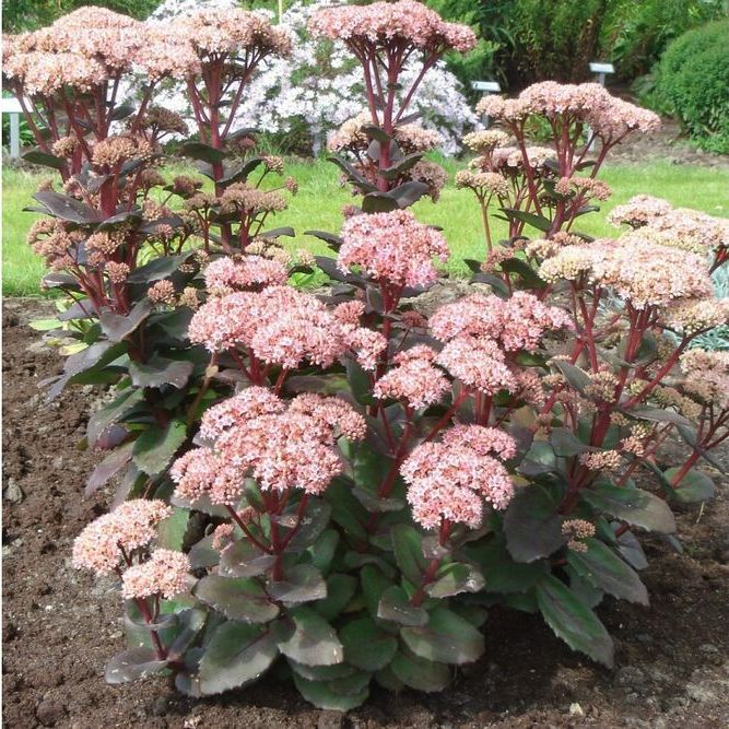 В них объединяется несколько розовых бутончиков с заостренными лепестками, в раскрытом состоянии не превышающих 1-2 см. Аромат у очитка сорта Матрона приятный, но слабо ощутимый. Корневая система культуры – горизонтально разветвленная. Продолжительность жизни растения варьируется от 7 до 10 лет. Цветение очитка продолжается с августа по октябрь, считается весьма длительным.