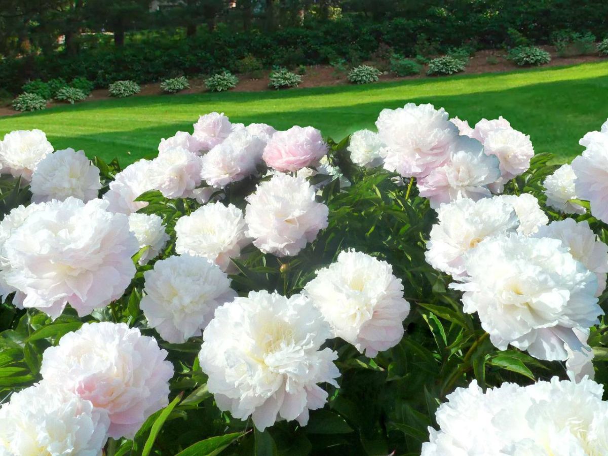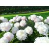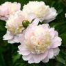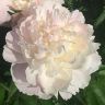 Ширли Темпл — густомахровый пион окрашен в молочный цвет с оттенками утренней зари на лепестках, кажется, что первые лучи восходящего солнца подарили нежную окраску этому цветку.