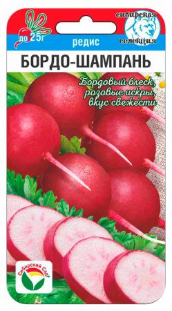 Розетка листьев компактная, корнеплоды очень ровные, однородные, бордово-малинового цвета, массой до 25г. Бордо-Шампань идеален для свежих витаминных салатов, оригинальных нарезок и украшения блюд. Сорт обладает высокой устойчивостью к цветушности. Урожайность до 2,5кг/м2.