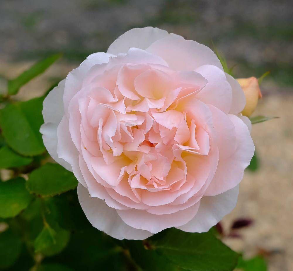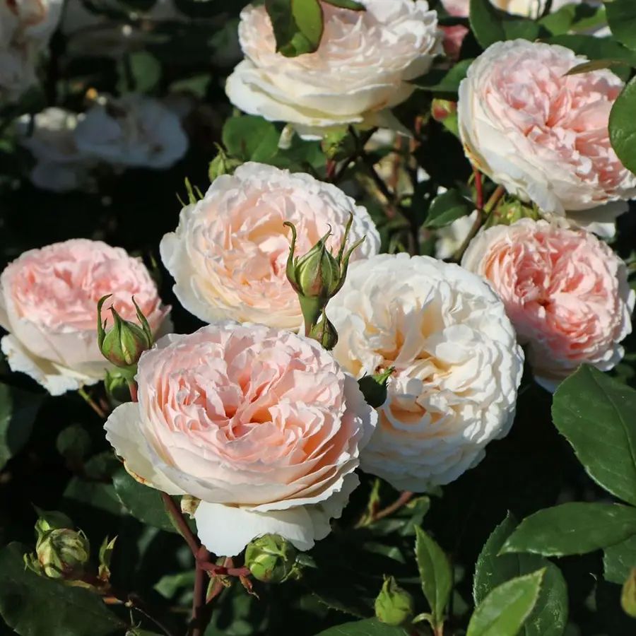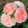 Цветы показывают очаровательную игру цветов между розовым, пастельным и абрикосовым, лепестки в кремово-розово-абрикосовых тонах, с золотисто-абрикосовым центром и светло-розовыми внешними лепестками. Цветки густомахровые старинной формы от чашевидной до розетковидной, диаметром 9-11 см. Цветение повторное, обильное в небольших соцветиях.
