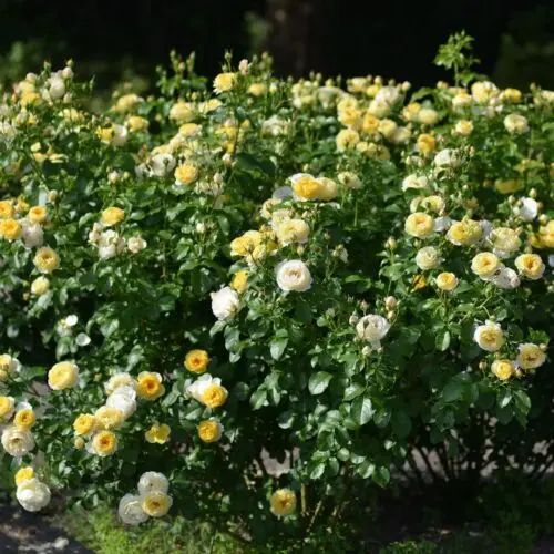 Многочисленные махровые чашевидные цветки окрашены в нежный сливочно-желтый цвет, со слегка розовеющими лепестками.