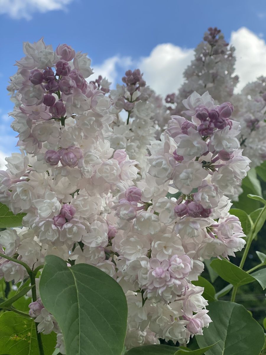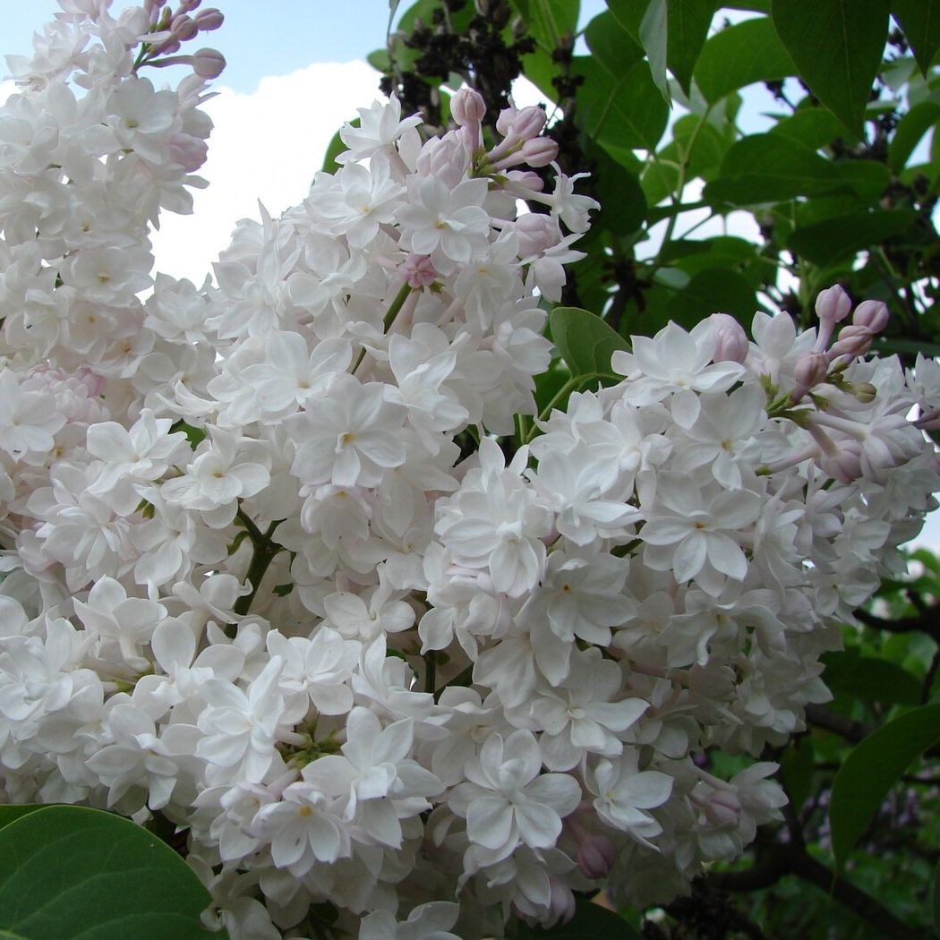 Цветоносы на сирени этого сорта прочные, прямостоячие, слегка опушенные. Соцветия у Красавицы Москвы крупные, пирамидальной формы. Когда они полностью распускаются, становятся очень плотными. Длина соцветия до 25 см, ширина около 12см, а полиантовые розочки, бутоны крупные, шаровидной формы. Оттенок розовато-белый с перламутровым отливом.