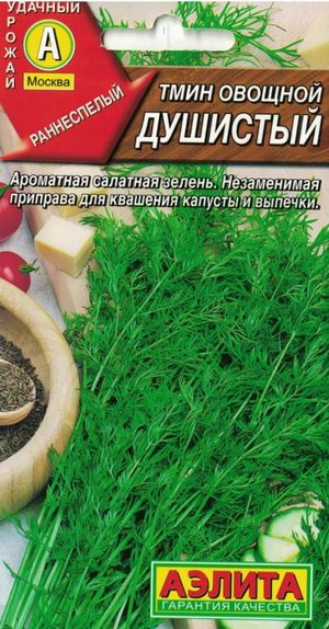 Раннеспелый сорт популярной пряной культуры. Растения двулетние, в первый год образуют пышную розетку листьев высотой 40-45 см. На второй год развиваются быстро и дают раннюю витаминную зелень через месяц после начала отрастания. Зацветают через два месяца. Ароматные листья и молодые побеги отлично дополняют вкус салатов и гарниров. Душистые семена со сладковато-жгучим вкусом (образуются на второй год) – лучшая специя для квашеной капусты, для выпечки и домашнего консервирования. Урожайность зелени 1,8-1,9 кг/м2. Для ускорения прорастания семена при весенне-летнем посеве желательно на сутки замочить в воде, 3-4 раза меняя воду. Подзимний посев проводят сухими семенами. Тмин светолюбив, холодо- и морозостоек, не требователен к почвенному плодородию, но на богатых почвах дает более значительный урожай