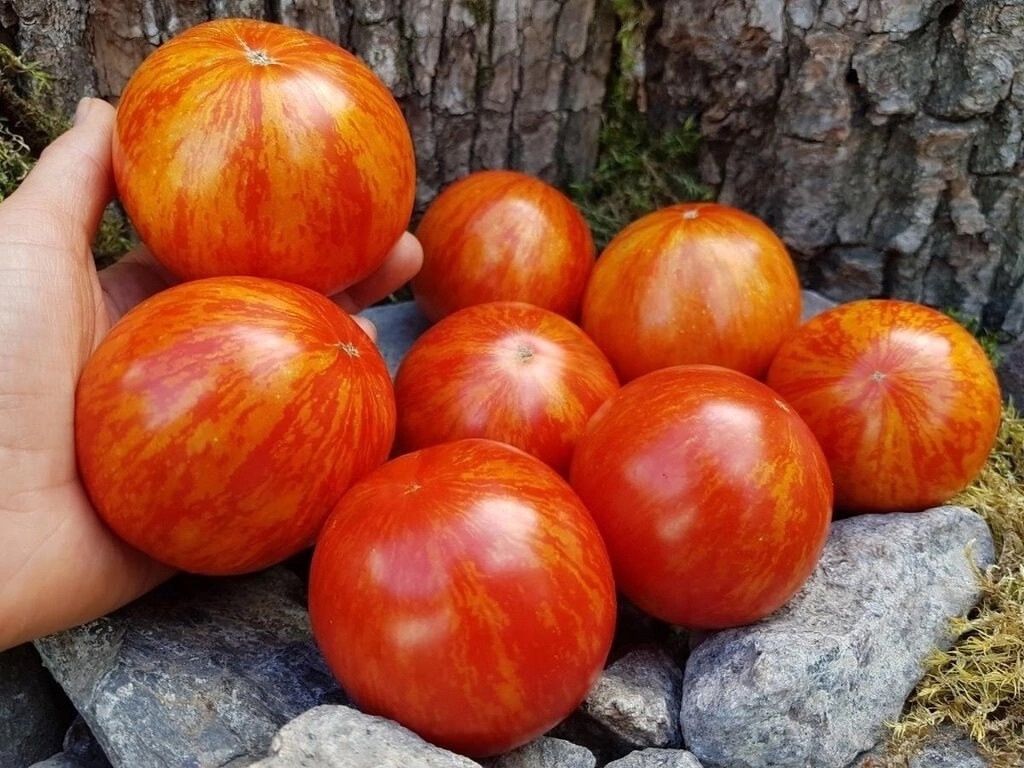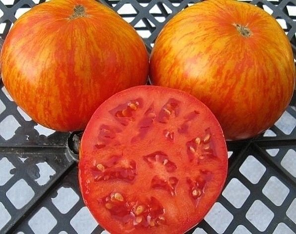 Плоды округлые, окраска пестрая с желтыми штрихами и полосами на красном фоне. Стенки толстые, мякоть красная, вкус классический томатный, сладкий.